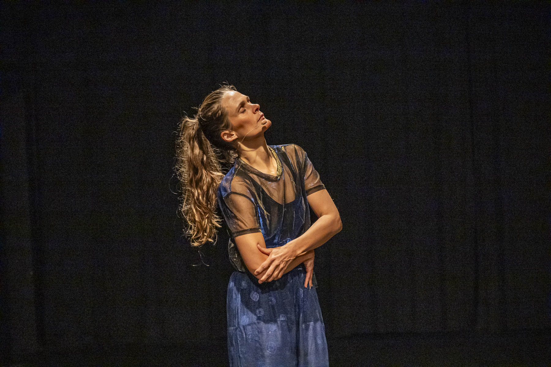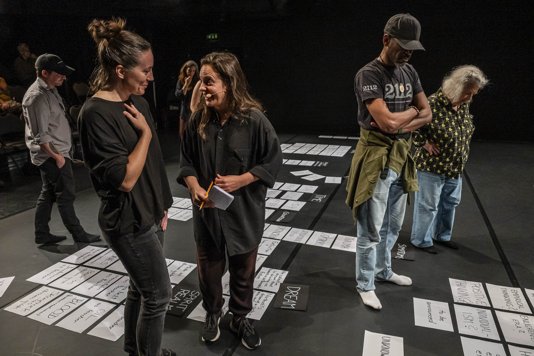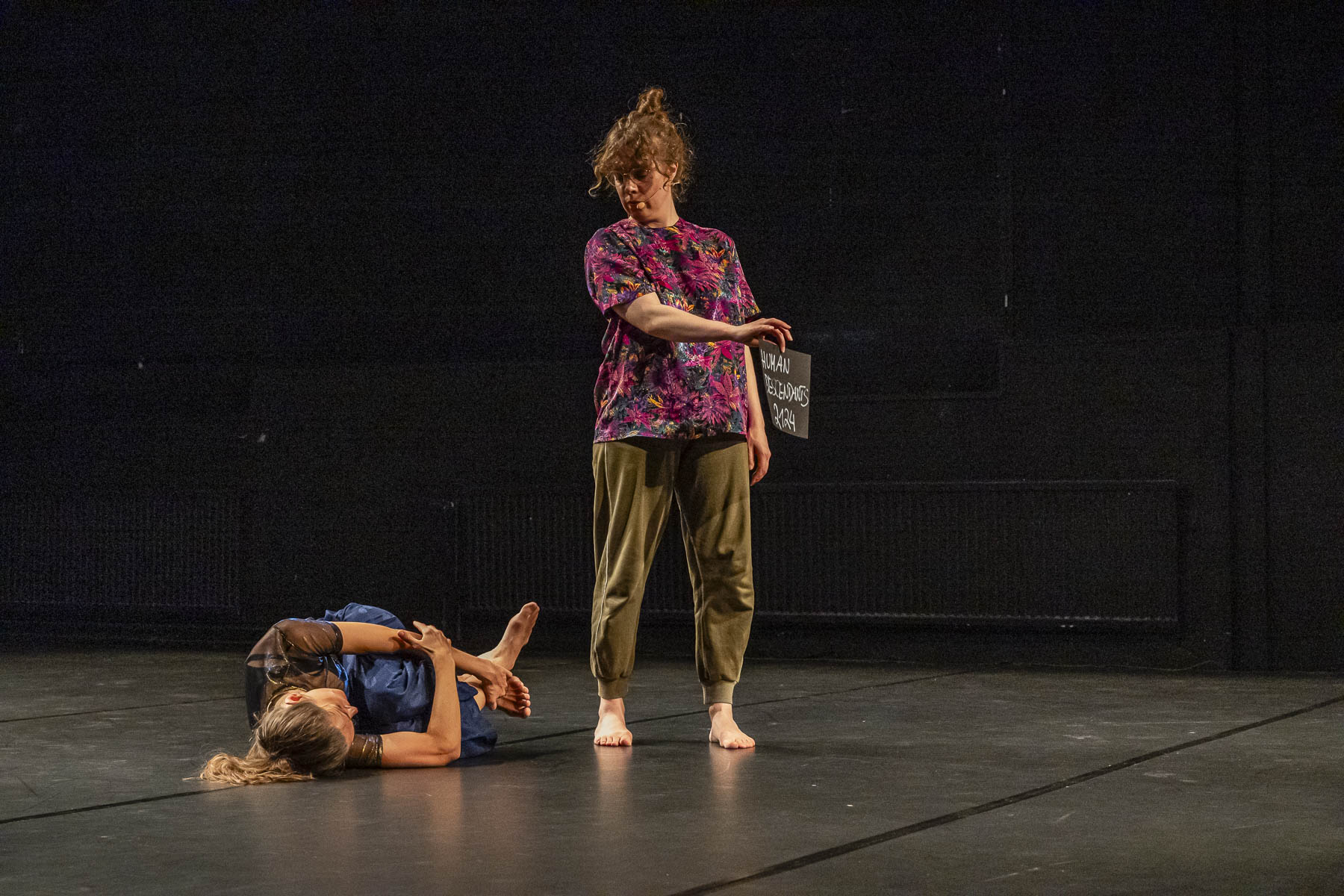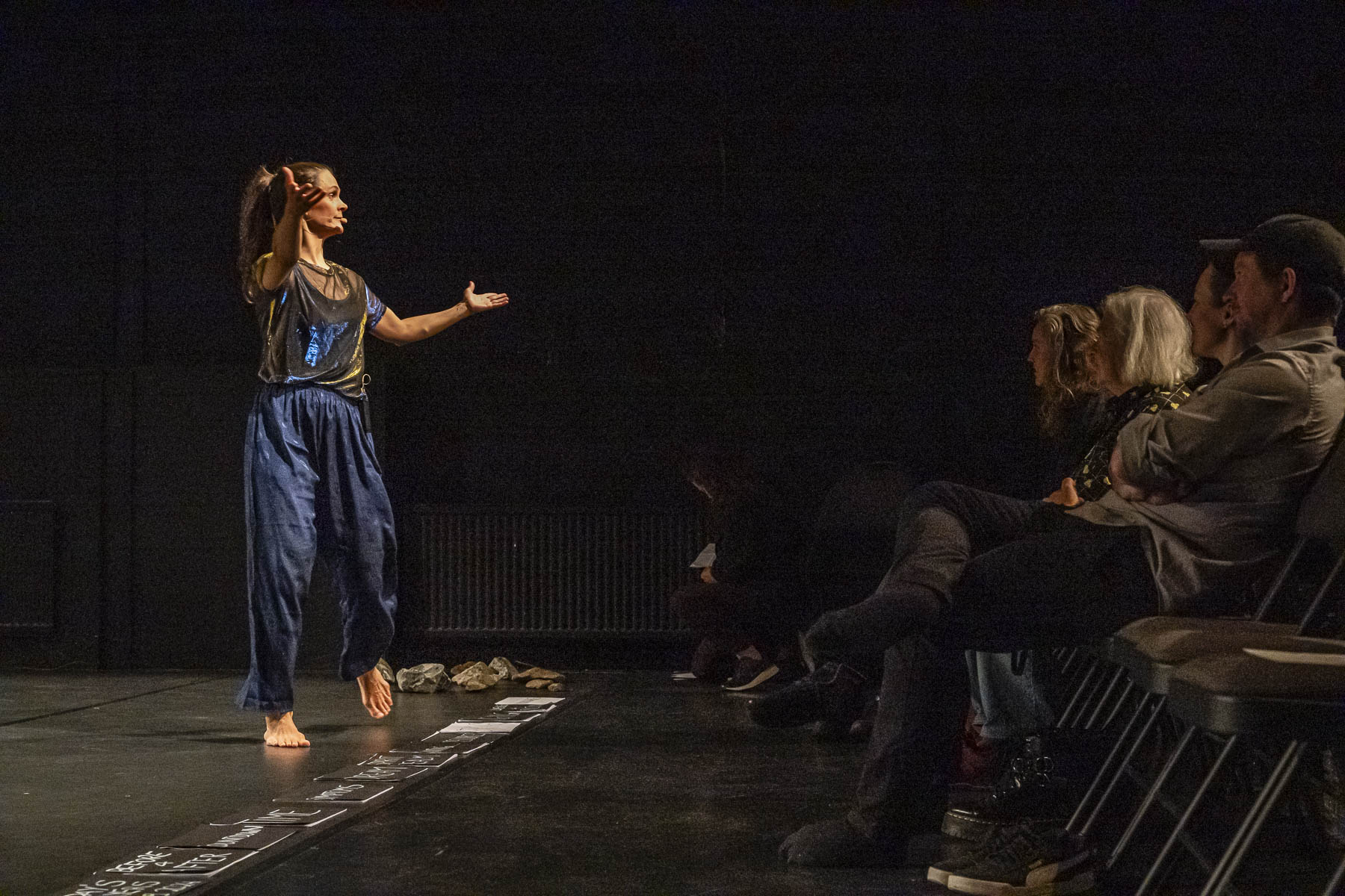 These performative constellations can be described as living cartography, sensory sculptures, and a contemporary ritual, where a collective narrative unfolds in real-time. Each performance is unique and guided by a performance host who, together with the audience, selects several topics. Only the host and the audience are aware of the choices made— the performers themselves do not know which topics they will bring to life. Once they enter the stage, the performers choose an unknown topic and, through the improvisational method of Choreo-Constellating, give it a bodily expression and a physical presence – through movement, language and voice.